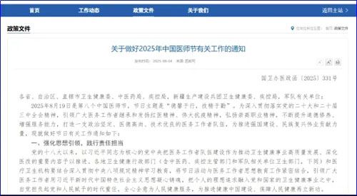2025年8月4日,国家卫生健康委办公厅、国家中医药局综合司、国家疾控局综合司、中央军委后勤保障部卫生局印发《关于做好2025年中国医师节有关工作的通知》,确定今年8月19日第八个中国医师节的节日主题是——“德馨于行,技精于勤”。