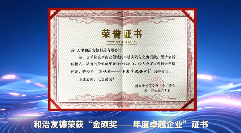 2025年9月9日,以“聚能汇势—稳大盘・求发展・谋创新”为核心主题的第六届新商业价值交互大会暨 2025 数字经济 AI 赋能高峰论坛在北京召开。天津和治友德制药有限公司受邀参加本次活动,并获颁“金硕奖——年度卓越企业”奖项。