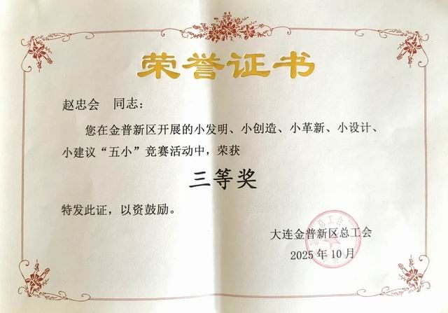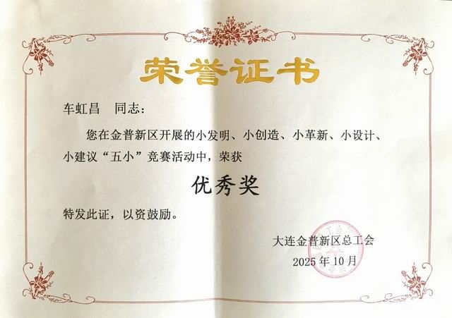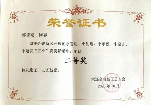 近日,从金普新区总工会传来喜讯,大连双迪科技股份有限公司(以下简称为:双迪股份)在2025年度“五小”创新成果评选活动中表现卓越,申报的四项成果全部获奖。其中设备管理部邹德充获二等奖,生产部赵忠会获三等奖,设备管理部姜龙章、研发二部车虹昌获优秀奖。本年度共吸引了来自50家基层单位的564项成果参与“五小”角逐,能够脱颖而出充分彰显了双迪公司在群众性技术创新领域的雄厚实力。