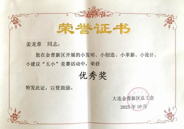 设备管理部姜龙章荣获“五小”竞赛优秀奖