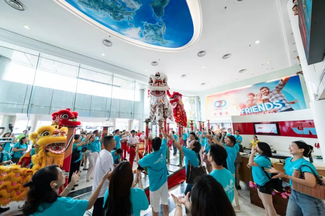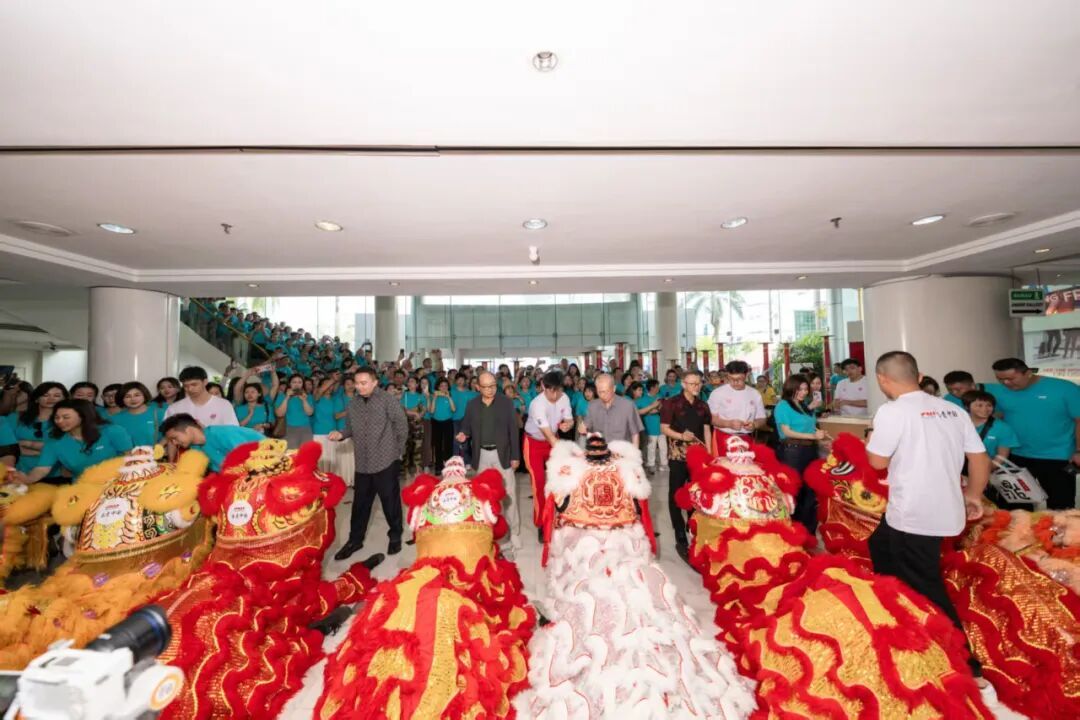 参观完城市风光后,伙伴们怀着激动的心情探访了CNI长青总部。探访当天,CNI创办人拿督高程祖率领管理层,一早就在大门口迎接归家的家人们。一声声亲切问候让每位家人都感受到家的温暖。除了高层们的迎接,长青公司用最地道最隆重的欢迎仪式——马来西亚麻坡关圣宫龙狮团高桩舞狮,来欢迎远道归来的家人们。精彩的高桩舞狮表演,瞬间点燃了现场的热情。