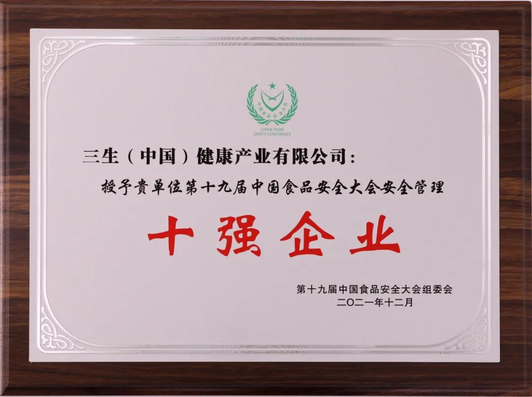 上月末,在北京召开的第十九届中国食品安全大会上,三生第十一次蝉联“中国食品安全十强企业”。